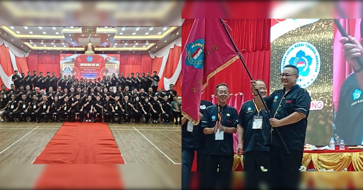 Gambar: Suasana Musyawarah Kabupaten (Muskab) ke-VII PSMTI Inhil yang berlangsung penuh keakraban di Gedung Serba Guna Hati Gemilang, Tembilahan. Tampak Martinus Felix Handoyo yang terpilih secara aklamasi sebagai Ketua PSMTI Kabupaten Inhil periode 2025-2029 mengibarkan pataka organisasi didampingi jajaran pengurus demisioner dan panitia acara.