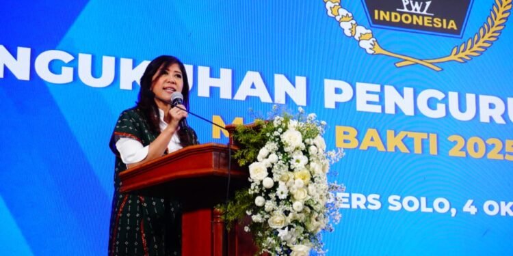 Gambar: Menteri Komunikasi dan Digital (Komdigi) Meutya Hafid memberikan sambutan dalam acara Pengukuhan Pengurus PWI Pusat Masa Bakti 2025-2030 di Monumen Pers Nasional, Surakarta, Sabtu (4/10/2025). Meutya menekankan pentingnya sinergi antara pemerintah, baik pusat maupun daerah, dengan PWI untuk menjaga kualitas jurnalisme dan menangkal hoaks.