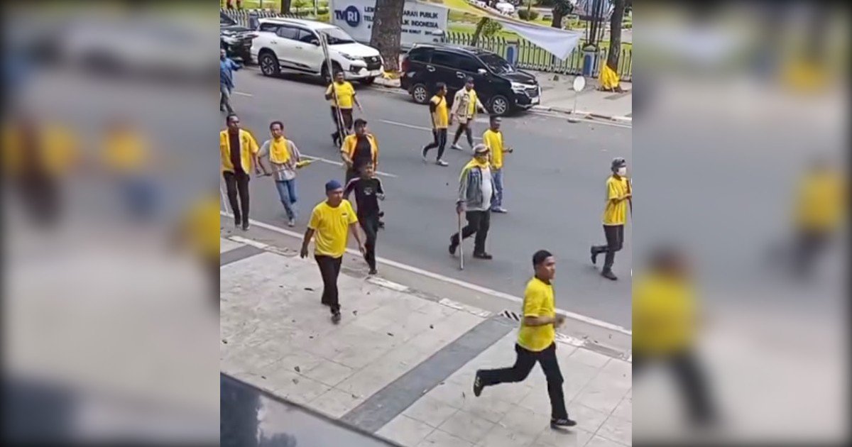 Gambar: Sejumlah massa yang mengenakan atribut kaus berwarna kuning khas partai terlihat berlarian dan membawa benda tumpul berupa kayu di jalan protokol depan gedung, dengan latar belakang kendaraan yang terparkir dan suasana tegang di sekitar lokasi kejadian.