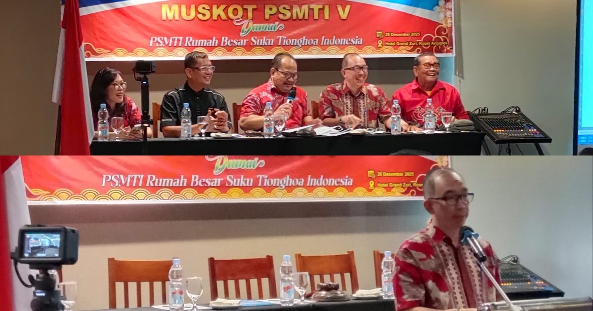 Gambar: Suasana Musyawarah Kota (Muskot) V PSMTI Dumai yang berlangsung di Hotel Grand Zuri pada Minggu, 28 Desember 2025. Foto atas memperlihatkan lima pimpinan sidang, termasuk Patrik Tatang, tampak semringah memimpin jalannya musyawarah dengan latar spanduk resmi acara. Foto bawah menunjukkan salah satu pimpinan sedang berbicara di podium, memastikan transparansi dan kelancaran agenda pemilihan yang menetapkan Zainal Arif sebagai ketua terpilih periode 2025-2029.