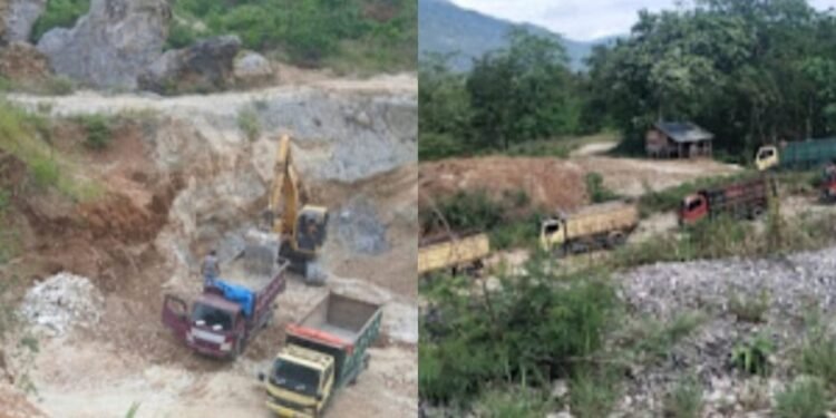 Gambar: Aktivitas tambang galian C ilegal yang diduga dikelola oknum Pegawai Negeri Sipil di Kabupaten Solok menunjukkan alat berat excavator dan beberapa truk pengangkut material beroperasi di area penambangan. Lokasi penambangan terlihat berada di kawasan terbuka dengan kondisi tanah yang sudah dikeruk untuk mengambil material pasir dan batu (sirtu) sebagai bahan bangunan.
