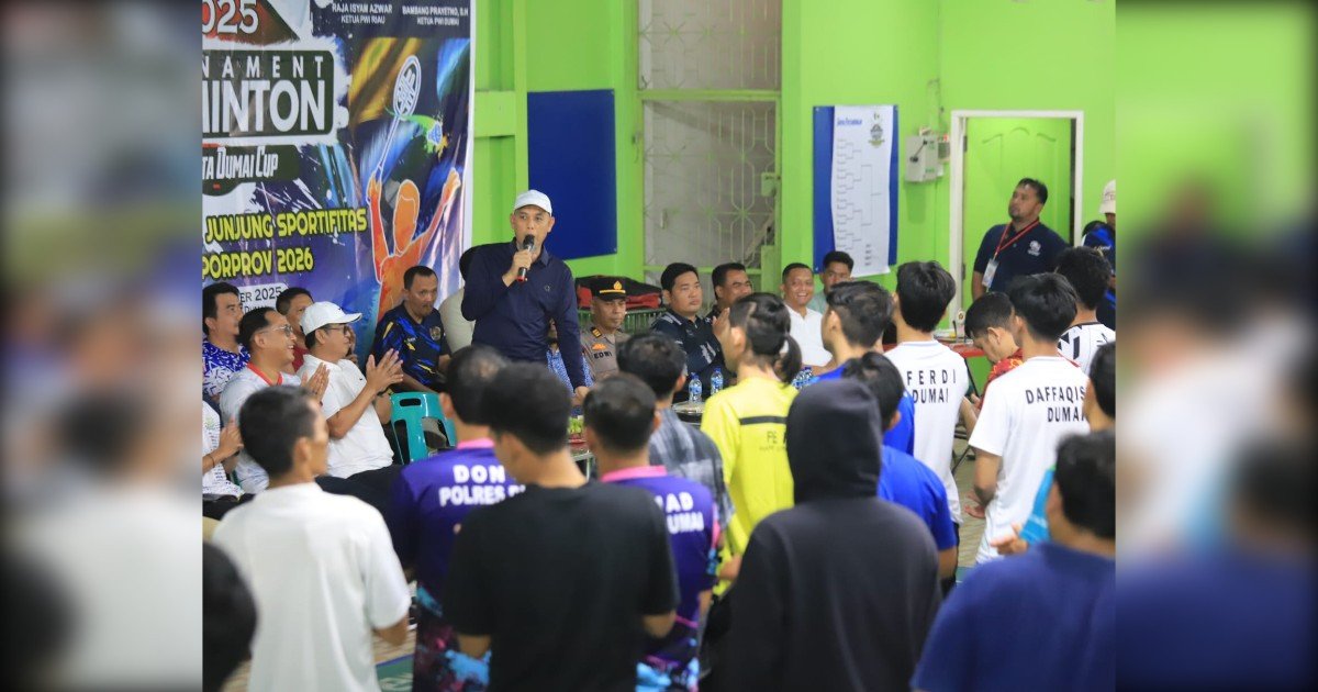 Gambar: Wali Kota Dumai, H. Paisal, memberikan sambutan sekaligus membuka secara resmi Open Tournament Badminton Wali Kota Dumai Cup 2025 di Olympia Sport Hall, Sabtu (8/11/2025). Turnamen yang diselenggarakan PWI Dumai ini bertujuan untuk membangkitkan semangat olahraga dan menjalin silaturahmi di kalangan atlet serta wartawan.