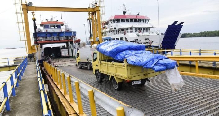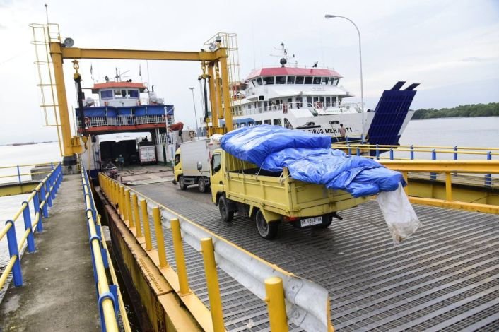 Gambar: Sebuah truk berwarna kuning dengan muatan tinggi yang ditutup terpal biru sedang menaiki jembatan gerak (movable bridge) di Pelabuhan Penyeberangan Ro-Ro Dumai-Rupat, dengan latar belakang kapal feri KMP Tirus Meranti yang sedang bersandar di dermaga.