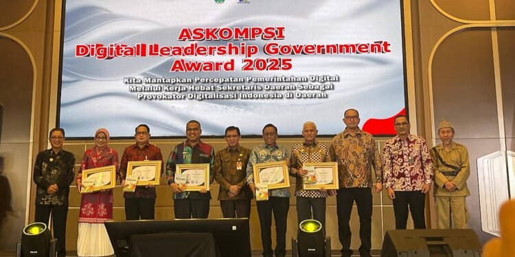 Gambar: Direktur Jenderal Bina Pembangunan Daerah Kemendagri Restuardy Daud bersama Ketua ASKOMPSI dan para penerima penghargaan ASKOMPSI Digital Leadership Government Award 2025 berfoto bersama di atas panggung Hotel Mercure Surabaya Grand Mirama. Dalam foto terlihat sepuluh orang mengenakan batik dan pakaian formal berdiri sejajar, di mana lima orang di tengah memegang piagam penghargaan berlatar kuning dengan bingkai emas. Latar belakang menampilkan layar besar bertuliskan ASKOMPSI Digital Leadership Government Award 2025 dengan tagline tentang percepatan pemerintahan digital melalui peran sekretaris daerah sebagai provokator digitalisasi Indonesia di daerah. Acara penganugerahan ini menandai apresiasi kepada 15 Sekretaris Daerah terbaik nasional dari tingkat provinsi, kota, dan kabupaten yang dinilai unggul dalam kepemimpinan digital dan transformasi SPBE di wilayahnya masing-masing.