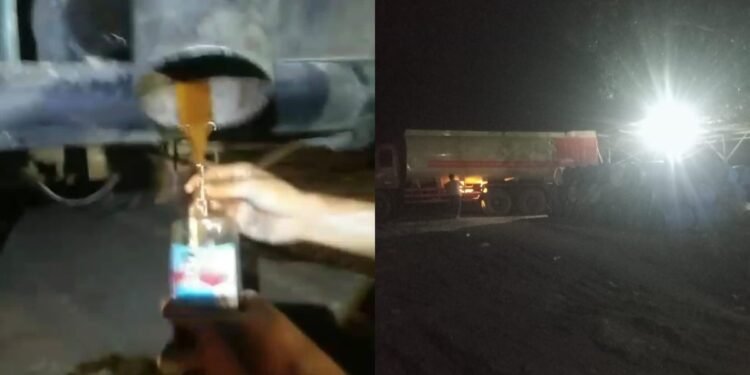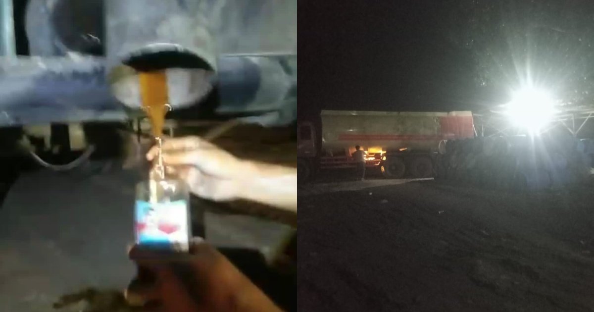 Gambar: Pekerja PT. Audi Energy Abadi lakukan pengambilan sampel limbah tanpa APD ketika membongkar muatan yang diduga material berbahaya pada hari Senin (19/01) dini hari kemarin (kiri). Sebuah truk tanki sedang lakukan aktivitas bongkar muat material diduga limbah berbahaya yang dilakukan PT. Audi Energy Abadi pada Senin (19/01) dini hari kemarin (kanan). (sumber: istimewa).