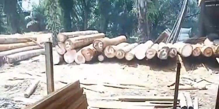Gambar: Tumpukan kayu gelondongan yang diduga merupakan hasil dari aktivitas pembalakan liar (ilegal logging) di salah satu tempat penampungan di Kabupaten Solok Selatan, Sumatera Barat. Di lokasi juga terlihat beberapa kayu olahan yang siap diangkut.