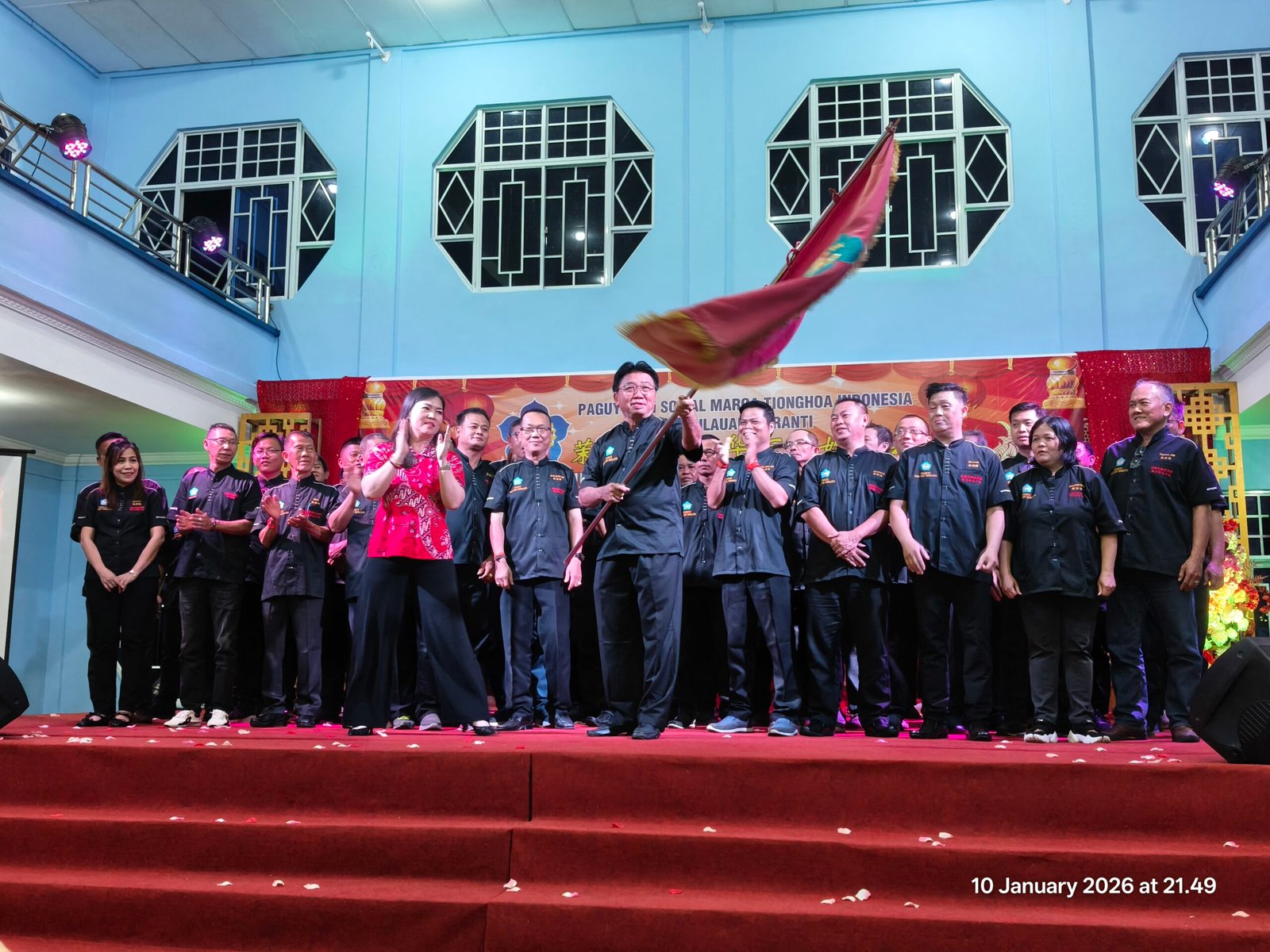 Gambar: Prosesi pengibaran bendera Pataka oleh Ketua PSMTI Kabupaten Kepulauan Meranti terpilih, Wanandi Salim, didampingi Plt. Ketua PSMTI Riau Lindawati (berbaju merah) dan jajaran pengurus saat pelantikan periode 2025-2029 di Selatpanjang, Sabtu (10/1/2026).