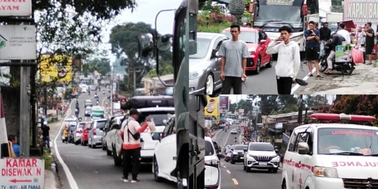 Gambar: Suasana kepadatan arus lalu lintas di jalur Puncak Bogor yang didominasi kendaraan roda empat dan bus pariwisata, terlihat mengular di tengah pemberlakuan sistem satu arah. Di sisi bahu jalan, sejumlah warga dan pedagang kaki lima tampak memanfaatkan momentum kemacetan untuk berinteraksi dan menjajakan dagangan, sementara satu unit ambulans terlihat melintas di tengah kepadatan jalur yang diawasi petugas.