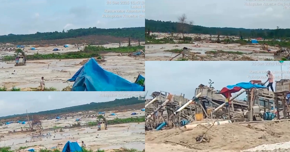 Gambar: Kolase foto hasil investigasi lapangan tim Utusan Rakyat pada 24-25 Desember 2025 yang memperlihatkan kerusakan lingkungan masif akibat aktivitas Penambangan Emas Tanpa Izin (PETI) di wilayah Kuantan Mudik, Kuantan Singingi. Terlihat hamparan lahan yang rusak menjadi kubangan lumpur, keberadaan tenda-tenda biru para penambang, serta alat berat dan instalasi mesin dompeng yang beroperasi secara terbuka di sekitar area perkebunan dan sempadan sungai.