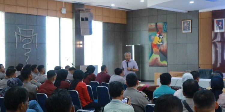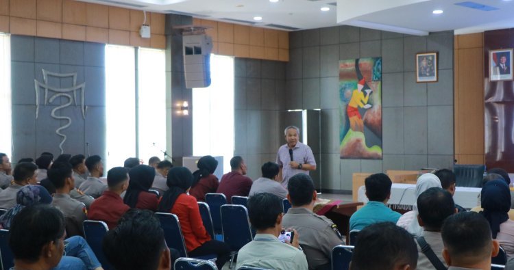 Gambar: Suasana kegiatan Sharing Komunikasi dan Motivasi yang digelar Polda Sumatera Barat di Ruangan Hoegeng, Mapolda Sumbar, dengan narasumber pakar komunikasi Dr. Aqua Dwipayana yang berdiri di depan audiens personel kepolisian.