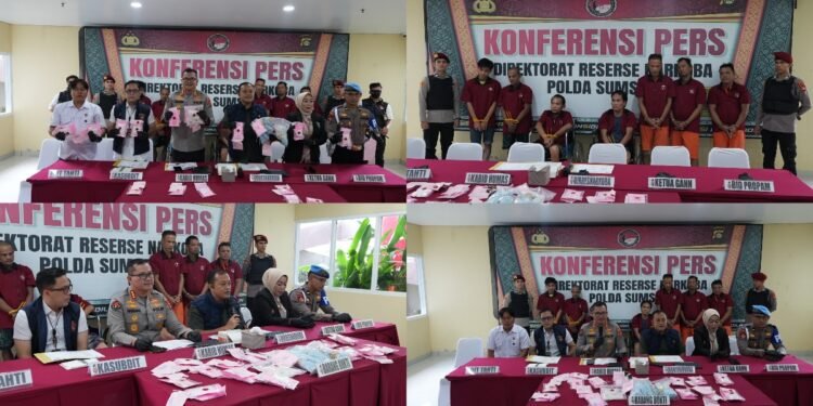 Gambar: Jajaran Direktorat Reserse Narkoba Polda Sumsel saat menggelar konferensi pers pengungkapan kasus peredaran narkotika dengan menghadirkan tujuh tersangka dan barang bukti di Mapolda Sumsel, Rabu (1/10/2025). Tiga dari tujuh tersangka terpaksa dilumpuhkan dengan timah panas karena melakukan perlawanan saat ditangkap.
