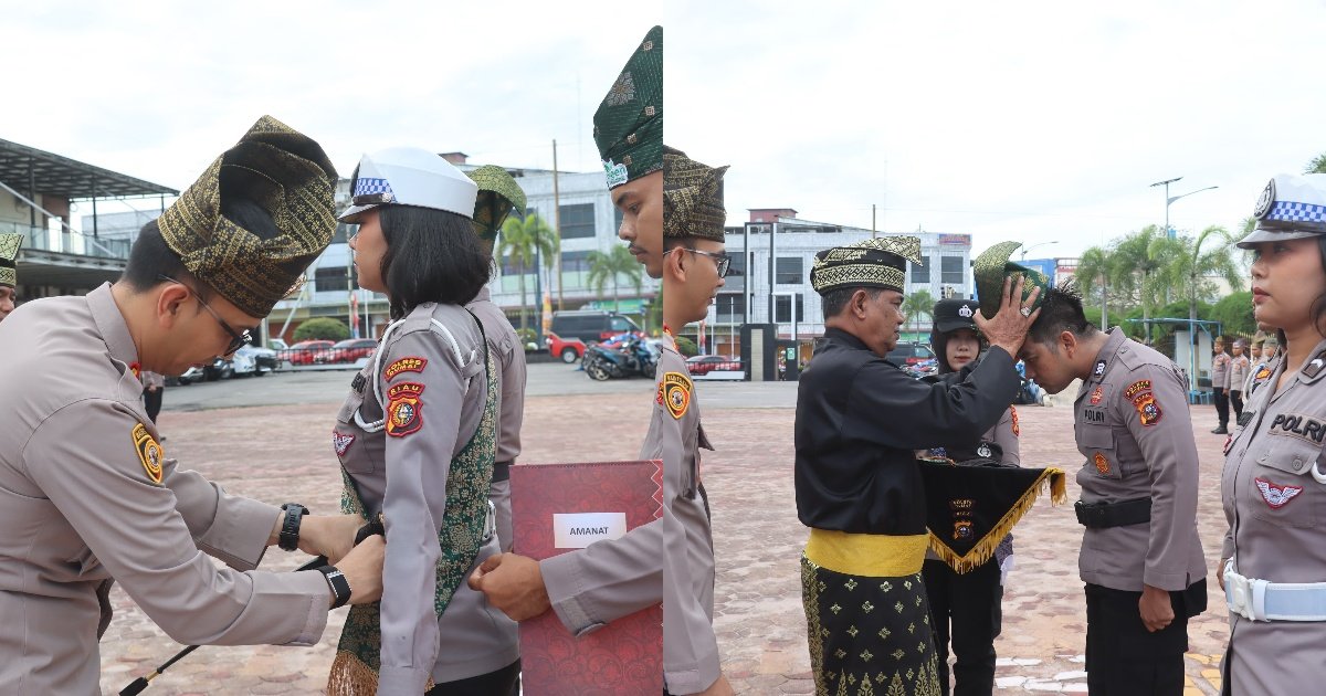 Gambar: Momen pemasangan selempang berwarna hijau kepada personel Polwan oleh Kapolres Dumai dan pemasangan penutup kepala tradisional tanjak kepada personel polisi laki-laki oleh perwakilan Lembaga Adat Melayu (LAM) Kota Dumai dalam apel peluncuran di Halaman Mapolres Dumai.