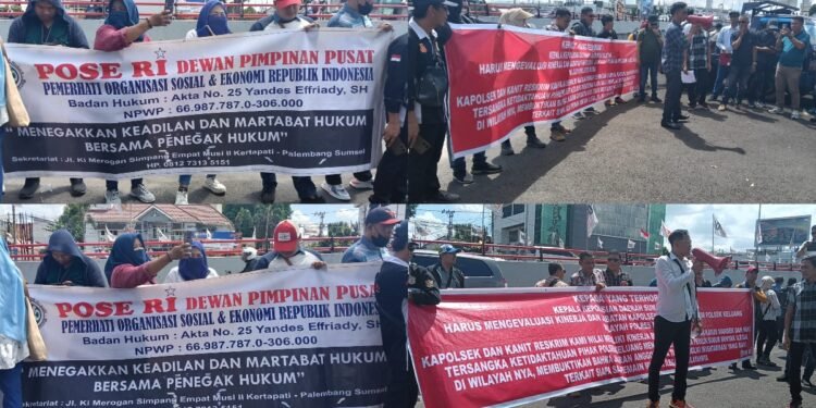 Gambar: Sejumlah massa dari Pemerhati Organisasi Sosial dan Ekonomi Republik Indonesia (POSE RI) menggelar aksi unjuk rasa di depan Markas Kepolisian Daerah (Mapolda) Sumatera Selatan, Rabu (1/10/2025). Dalam aksi tersebut, mereka membentangkan spanduk berisi tuntutan agar Kapolda Sumsel mengusut tuntas serangkaian kasus kebakaran sumur minyak ilegal dan mengevaluasi kinerja aparat kepolisian di Musi Banyuasin.