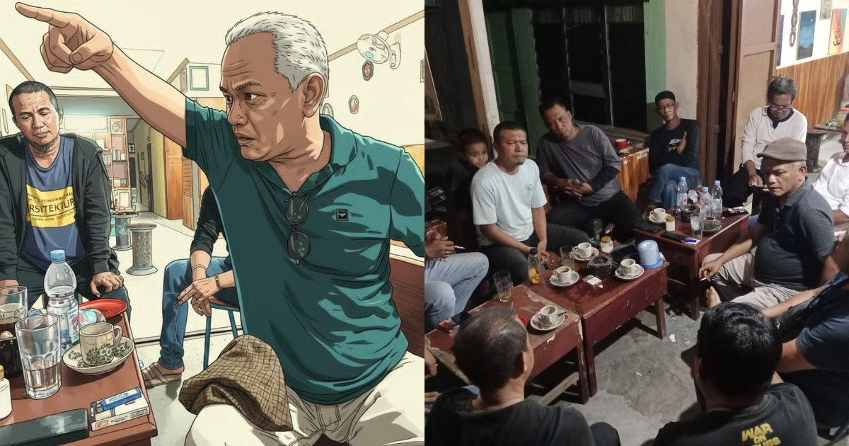 Gambar: Kolase visual yang menampilkan ilustrasi ekspresi kekecewaan Ketua Umum Dewan Kesenian Daerah (DKD) Kota Dumai, Agoes S. Alam, terhadap minimnya anggaran (kiri), disandingkan dengan foto dokumentasi suasana musyawarah internal pengurus DKD Dumai saat membahas langkah penolakan terhadap dana hibah Rp15 juta yang dinilai tidak realistis (kanan).