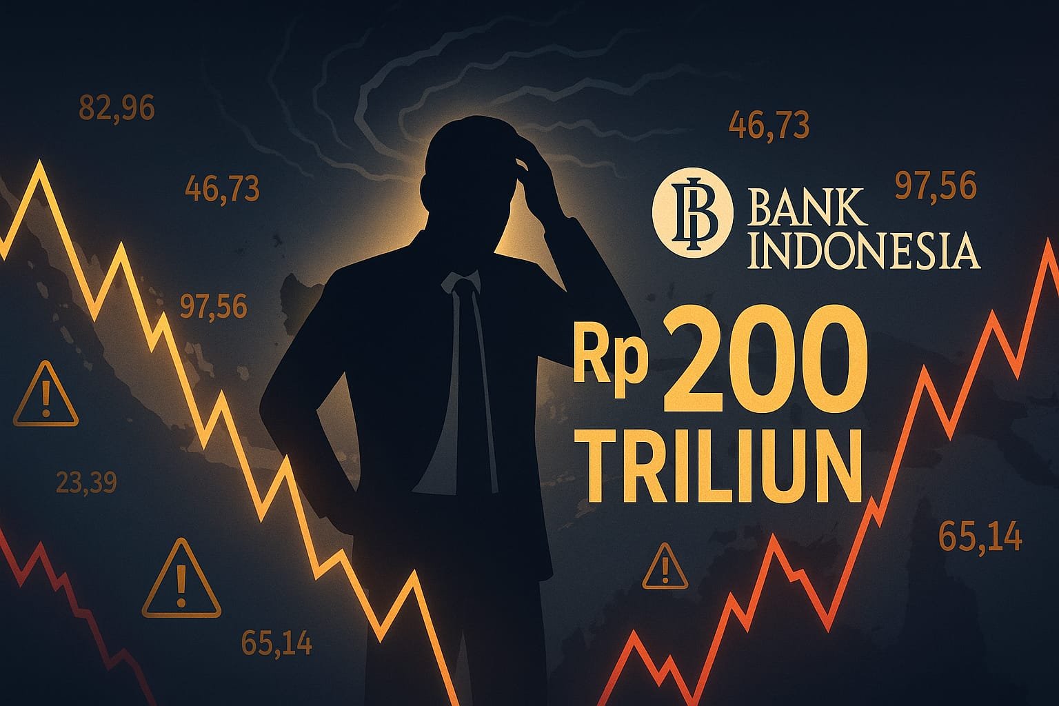 Gambar: Ilustrasi dramatik menampilkan siluet seseorang dengan gestur kebingungan di tengah grafik ekonomi yang fluktuatif, dengan logo Bank Indonesia dan angka Rp 200 triliun yang mencolok. Visualisasi ini menggambarkan ketegangan dan ketidakpastian dalam pengambilan kebijakan fiskal di tengah tekanan ekonomi yang kompleks, mencerminkan tantangan besar yang dihadapi pengambil kebijakan dalam mengelola stimulus ekonomi dan stabilitas fiskal nasional.