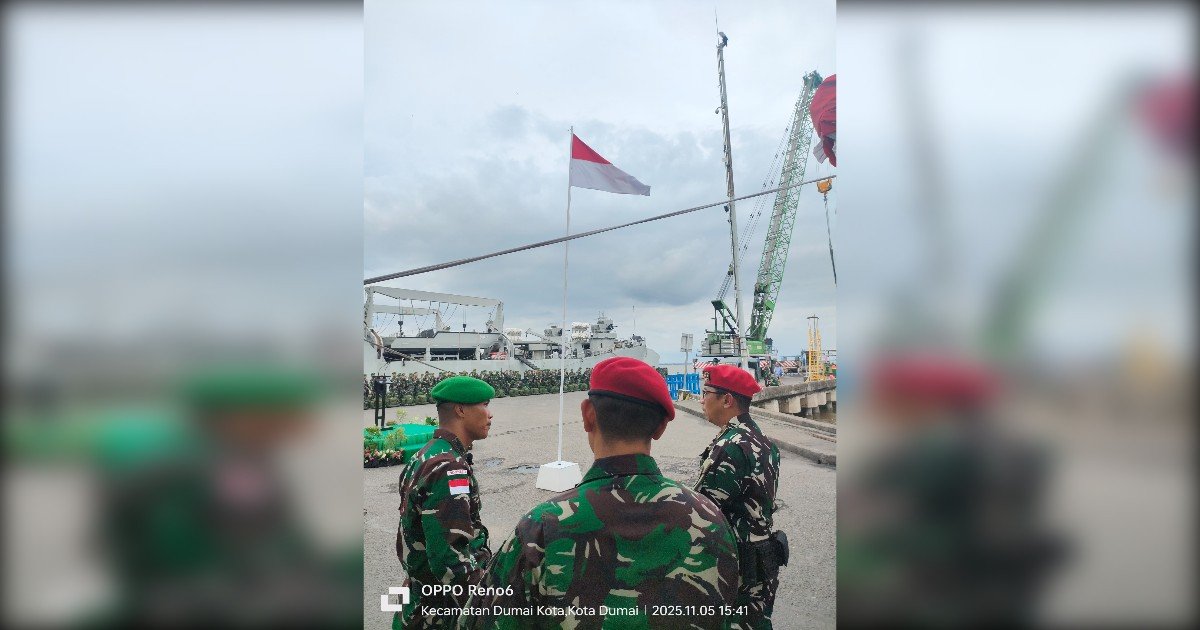 Gambar: Prajurit TNI AD dengan baret merah dan hijau berdiri di dermaga Pelabuhan Dumai dengan latar belakang KRI Teluk Banten 516 dan bendera Merah Putih berkibar, menyambut kepulangan ratusan personel Yonif 131/Braja Sakti yang telah menyelesaikan tugas pengamanan perbatasan RI-PNG selama satu tahun di Papua pada Rabu, 5 November 2025.