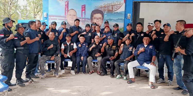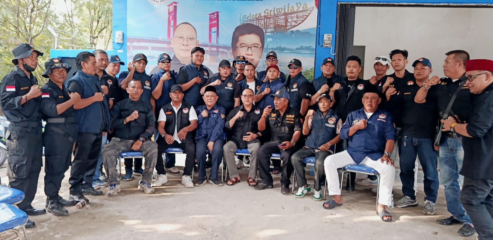 Gambar: Ketua Umum PMPB Sumsel, M. Yusuf Malaya, berfoto bersama jajaran pengurus dan anggota Paguyuban Masyarakat Palembang Bersatu di depan gedung sekretariat baru. Tampak para anggota mengenakan seragam rompi hitam berlogo organisasi serta pakaian sipil, berpose mengepalkan tangan sebagai simbol semangat persatuan dengan latar belakang spanduk bergambar Jembatan Ampera.