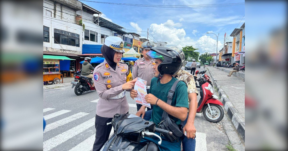 Gambar: Kasat Lantas Polres Kampar, AKP Wulan Afdhalia Ramdhani, memberikan brosur sosialisasi Operasi Zebra Lancang Kuning 2025 kepada seorang pengendara sepeda motor di kawasan Pasar Inpres Bangkinang, Senin (17/11/2025). Kegiatan ini merupakan bagian dari upaya edukasi dan sosialisasi untuk meningkatkan kesadaran masyarakat akan pentingnya keselamatan berlalu lintas.