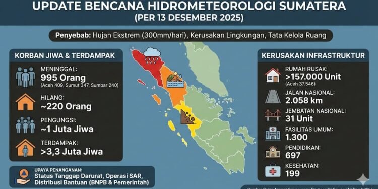 Gambar: Sebuah infografis menyajikan data pembaruan bencana hidrometeorologi di Sumatera per 13 Desember 2025. Visual ini menampilkan peta Pulau Sumatera dengan ikon awan hujan dan banjir di wilayah utara hingga tengah, serta rincian statistik dampak bencana yang mencakup 995 korban jiwa, 1 juta pengungsi, dan kerusakan infrastruktur masif seperti lebih dari 157.000 rumah rusak akibat hujan ekstrem dan tata kelola lingkungan yang buruk.