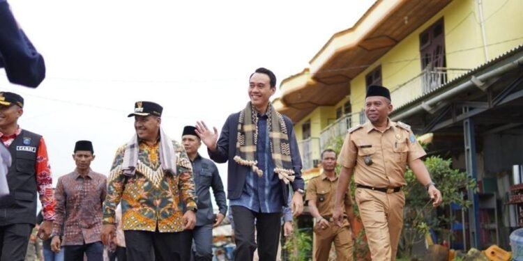 Gambar: Bupati Ogan Komering Ilir, H. Muchendi Mahzareki, dengan ekspresi sumringah berjalan beriringan bersama Camat, Kepala Desa, serta jajaran tokoh masyarakat saat melakukan kunjungan kerja dan peninjauan infrastruktur di Kecamatan Air Sugihan. Kehadiran Bupati yang mengenakan kemeja biru tua dengan syal bermotif kotak-kotak ini disambut antusias, mencerminkan sinergi kuat antara pemerintah daerah dan masyarakat dalam mengawal pembangunan konektivitas di wilayah pesisir.