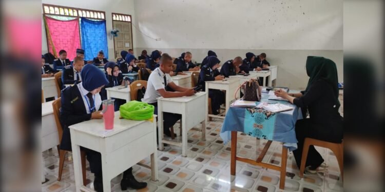 Gambar: Suasana para taruna dan taruni SMK Penerbangan Sriwijaya saat mengikuti pelaksanaan Penilaian Akhir Semester (PAS) Gasal Tahun Ajaran 2025–2026 di dalam kelas, tampak para siswa mengerjakan soal ujian dengan fokus, tertib, dan mengenakan seragam dinas harian lengkap diawasi oleh pengawas ujian.