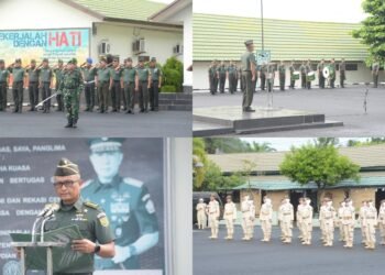 Gambar: Kolase foto menampilkan jalannya Upacara Peringatan Hari Sumpah Pemuda ke-97 Tahun 2025 di Korem 044/Gapo. Palembang (Utusan Rakyat) - ...
