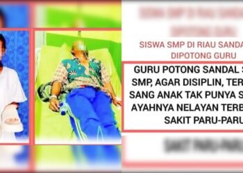 Gambar: Kolase foto yang menampilkan siswi SMP berinisial KL memegang sandal jepitnya yang terpotong, potret sang ayah yang terbaring sakit, ...