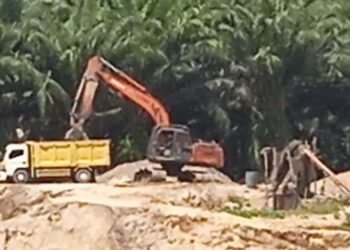 Gambar: Sebuah alat berat ekskavator berwarna oranye terlihat sedang melakukan aktivitas pemuatan material tanah ke dalam truk (dump truck) berwarna ...