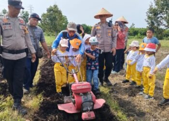 Read moreDetailsGambar: Personel kepolisian bersama anak-anak usia dini sedang melakukan kegiatan edukasi pengenalan alat pertanian berupa traktor tangan di lahan perkebunan, ...