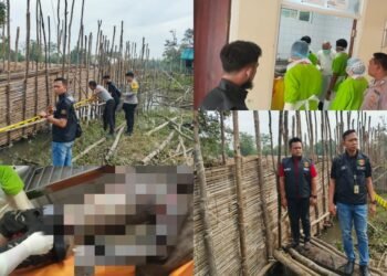Gambar: Kolase foto yang menampilkan proses evakuasi jenazah pria tanpa identitas (Mr. X) oleh aparat kepolisian di aliran Sungai Sindu, ...