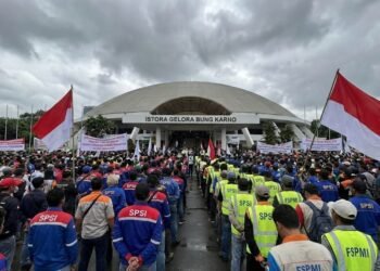 Gambar: Ilustrasi massa buruh dengan seragam serikat pekerja memadati depan gedung Istora Senayan Jakarta, suasana mendung dramatis, bendera merah putih ...