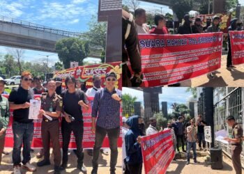 Gambar: Ratusan massa dari Lembaga Swadaya Masyarakat Pembela Suara Rakyat (PSR) menggelar aksi demonstrasi damai di Palembang dengan membentangkan spanduk ...