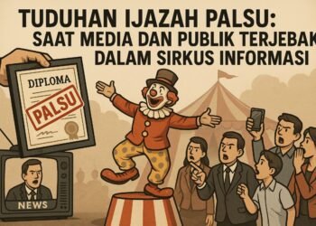 Read moreDetailsGambar: Ilustrasi visual yang menggambarkan tuduhan ijazah palsu sebagai sirkus informasi. Tampak sebuah tangan keluar dari televisi berlabel "NEWS" menyodorkan ...