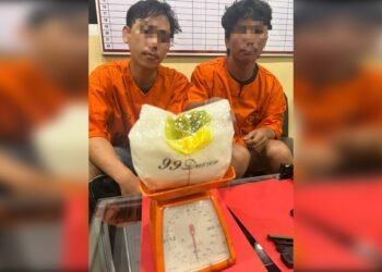 Gambar: Dua tersangka kurir narkoba, MS dan MR, diamankan di Polres Dumai bersama barang bukti 1 kilogram sabu yang dikemas ...
