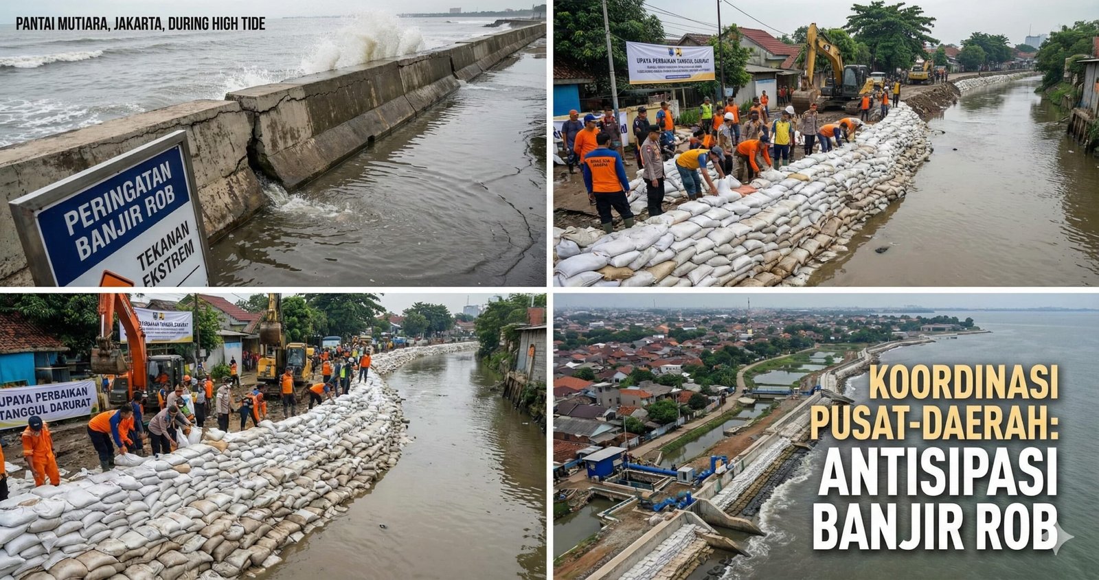 Gambar: Kolase ilustrasi ini menggambarkan upaya komprehensif dalam menghadapi dan menangani ancaman banjir rob di pesisir Jakarta, yang menekankan pentingnya kolaborasi antar-lembaga dalam mitigasi bencana ini. (Dok. UtusanRakyat/AI)