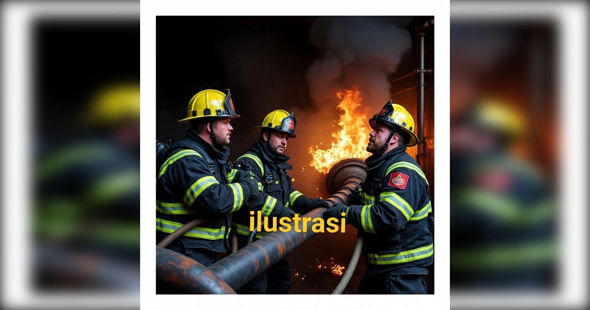 Gambar: Ilustrasi petugas pemadam kebakaran sedang melakukan penanganan darurat di lokasi insiden yang melibatkan api dan asap, menggambarkan situasi penanganan kebocoran pipa gas sesuai prosedur keamanan.