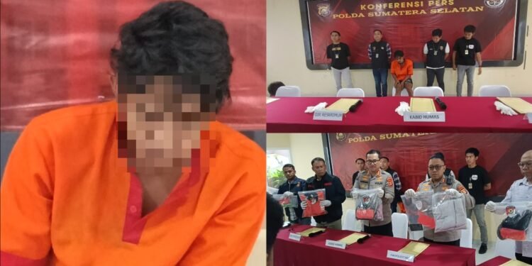 Gambar: Pelaku pembunuhan Febrianto alias Febri (22) saat berada di Polda Sumatera Selatan dalam konferensi pers pengungkapan kasus, Kamis (16/10/2025). Pelaku tampak mengenakan rompi tahanan berwarna oranye dengan wajah tertunduk. Di meja konferensi pers terlihat barang bukti berupa handphone dan berbagai item lainnya yang disita petugas dari tersangka. Tim penyidik dari Jatanras Polda Sumsel dan Satreskrim Polresta Palembang berhasil mengungkap kasus pembunuhan yang sempat menggegerkan masyarakat Palembang ini setelah melakukan pengejaran selama lima hari.
