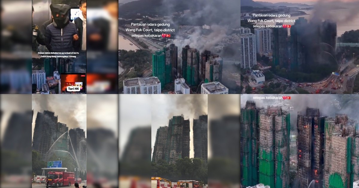 Gambar: Kolase foto-foto yang menunjukkan kebakaran masif di kompleks apartemen Wang Fuk Court, distrik Tai Po, Hong Kong. Gambar memperlihatkan tujuh menara apartemen setinggi 31 lantai yang terbakar dengan asap hitam pekat mengepul tinggi ke udara. Perancah bambu dan jaring hijau yang melapisi gedung-gedung terlihat jelas menjadi jalur api yang menyebar dengan cepat. Foto-foto diambil dari berbagai sudut termasuk foto udara dan dari permukaan tanah, memperlihatkan skala bencana yang luar biasa dengan api menjilat hampir di setiap bagian bangunan. Di bagian bawah terlihat petugas pemadam kebakaran dengan truk pemadam yang menyemprotkan air ke arah gedung-gedung yang terbakar. Teks overlay pada beberapa gambar menyebutkan lokasi kebakaran di Wang Fuk Court, Tai Po district, selepas kebakaran. Foto-foto ini mendokumentasikan salah satu kebakaran paling mematikan di Hong Kong dalam tiga dekade terakhir yang terjadi pada 26 November 2025.