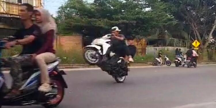 PEKANBARU (Utusan Rakyat) – Hingga sore ini, Sabtu (28/2/2026), aksi nekat kelompok remaja standing di Jalan Hang Tuah, Kelurahan Kulim, Kecamatan Tenayan Raya, Pekanbaru, masih terus terpantau. Tak hanya berdiri di pinggir jalan, beberapa remaja terlihat berkendara sambil mengangkat motornya, berpotensi membahayakan keselamatan diri sendiri maupun pengendara lain menjelang waktu berbuka puasa di bulan Ramadhan.
