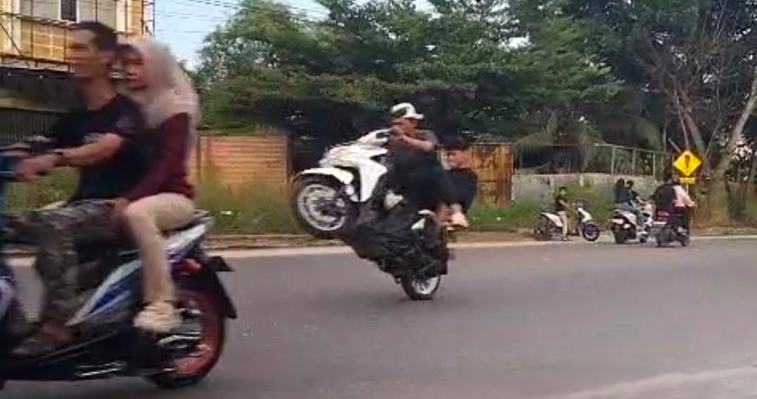 Gambar: Dua remaja terekam kamera sedang melakukan aksi nekat mengangkat roda depan sepeda motor yang sedang melaju di jalan raya, sementara pengendara roda dua lainnya, termasuk yang berboncengan, melintas tepat di sebelahnya. Aksi berbahaya ini sangat berisiko memicu kecelakaan lalu lintas dan membahayakan keselamatan pengguna jalan lain.