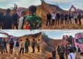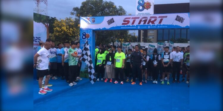 Gambar: Suasana pelepasan peserta Brimob Run 2025 di garis start yang berlokasi di depan Mapolda Riau, di mana terlihat Wali Kota Pekanbaru Agung Nugroho (baju hijau) turut serta memegang bendera start bersama jajaran pejabat Polda Riau di bawah gerbang start bertuliskan “80 Tahun Brimob Presisi Untuk Masyarakat”.