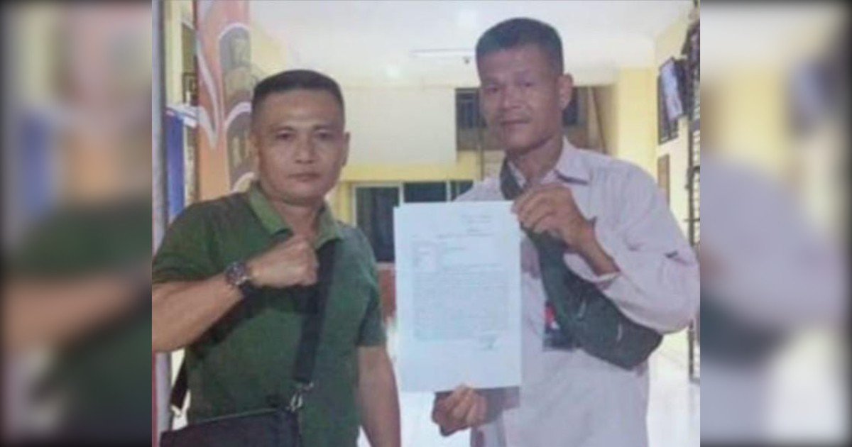 Gambar: Seorang wartawan, Noitoloni Hia (kanan), didampingi rekannya menunjukkan surat tanda terima laporan polisi di depan kantor Sentra Pelayanan Kepolisian Terpadu (SPKT) Polres Kuantan Singingi, Selasa (2/12/2025), usai melaporkan dugaan intimidasi yang dialaminya saat meliput aktivitas tambang ilegal.