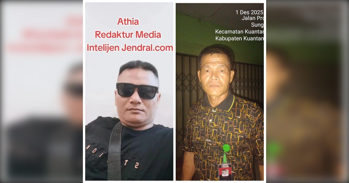 Gambar: Kolase foto yang menampilkan seorang pria berkacamata hitam dengan latar polos dan tulisan “Athia Redaktur Media Intelijen Jendral.com” di sisi kiri, serta seorang pria berkemeja motif geometris dengan kartu identitas tergantung di dada dan latar depan pintu teralis di sisi kanan, dengan keterangan waktu dan lokasi pemotretan di bagian atas yang menunjukkan konteks peliputan di wilayah Kuantan Singingi, Riau.