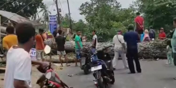 Gambar: Sejumlah warga berkumpul di sekitar pohon besar yang tumbang dan melintang di tengah jalan akibat cuaca buruk, menghambat akses lalu lintas kendaraan roda dua dan pejalan kaki di kawasan tersebut.